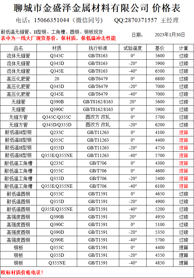 聊城市金盛澤金屬材料有限公司主營低合金/耐低溫無縫管,方矩管,H型鋼,工字鋼,角鋼,槽鋼,圓鋼,鋼板;現(xiàn)貨供應(yīng):大無縫、包鋼、煙寶、鳳寶正品耐低溫無縫管,專業(yè)加工生產(chǎn)無縫方矩管;經(jīng)營一線品牌型材:萊鋼/包鋼/馬鋼/日鋼 耐低溫Q235B/C;Q355B/C/D/NE H型鋼(100*100-1000*300) 偏型號H型鋼鋼現(xiàn)貨:250/255,248/124,344/348,394/398,506/201,606/201,458/417,912/302,692/300,792/300 ;萊鋼/馬鋼/宣鋼產(chǎn) 耐低溫槽…